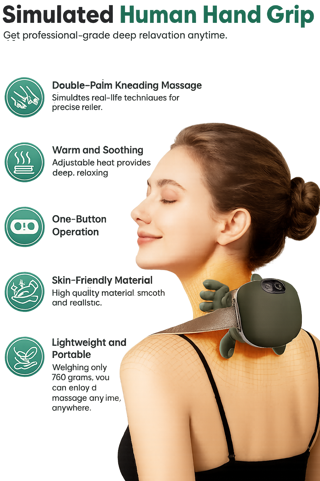 The device uses a multi-directional 3D kneading mechanism designed to replicate the feeling of human hands, delivering deeper and more effective muscle relief compared to traditional one-direction massagers.